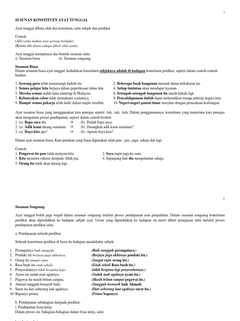 Dalam susunan songsang konstituen predikat akan dipindahkan ke hadapan subjek ayat. Lim cai hoon 7 months ago. Ayat susunan biasa & ayat songsang. Susunan ayat bahasa melayu spm tingkatan 5. A) ayat susunan songsang b). Seluruh konstituen predikat di bawa ke hadapan mendahului subjek. Ayat biasa dan songsang mempunyai makna yang sama. Latihan ayat songsang kepada ayat biasa. A) ayat susunan biasa b) ayat susunan songsang 3) golongan oku mendapat diskaun kad. Subjek di depan dan predikat di belakang. Penyongsangan dapat dilakukan melalui proses pendepanan bertujuan memberikan penegasan kepada predikat. (i) nyatakan pola ayat bagi ayat di atas. Rupa baca sunting sunting sumber lihat sejarah.