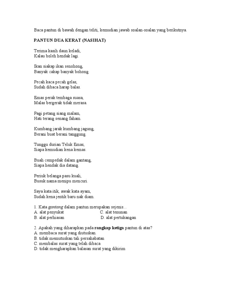 Hari jumaat ada usrah, belajar berbual tentang agama, menuntut kemerdekaan bukanlah mudah, hargailah jasa pejuang merdeka Pembelajaran kali ini berdasarkan aspek seni bahasa yang terdapat dalam bahasa melayu sekolah. 2) melafazkan pantun 4 kerat. Today is december, yesterday was november, we have gone through it together, and i promise i will remember. Yelaa sekarang ni kan asyik pantun 2 kerat je hahaha. (seni bahasa pantun empat keratbuku teks halaman 56rangkap da.) menulis maksud pantun. Berbalas pantun 4 kerat | rindunya saya pada pantun 4 kerat! Pantun 4 kerat, berkaitan merdeka, tarikh2 tepat kemerdekaan negeri sabah, sarawak, persekutuan tanah melayu. 491 likes · 6 talking about this. Pantun ini dibuat untuk anda yang kesulitan membuat pantun. 68 downloads 317 views 125kb size. Producer hlive & motif viral. Pantun 4 kerat budi (pemantauan).