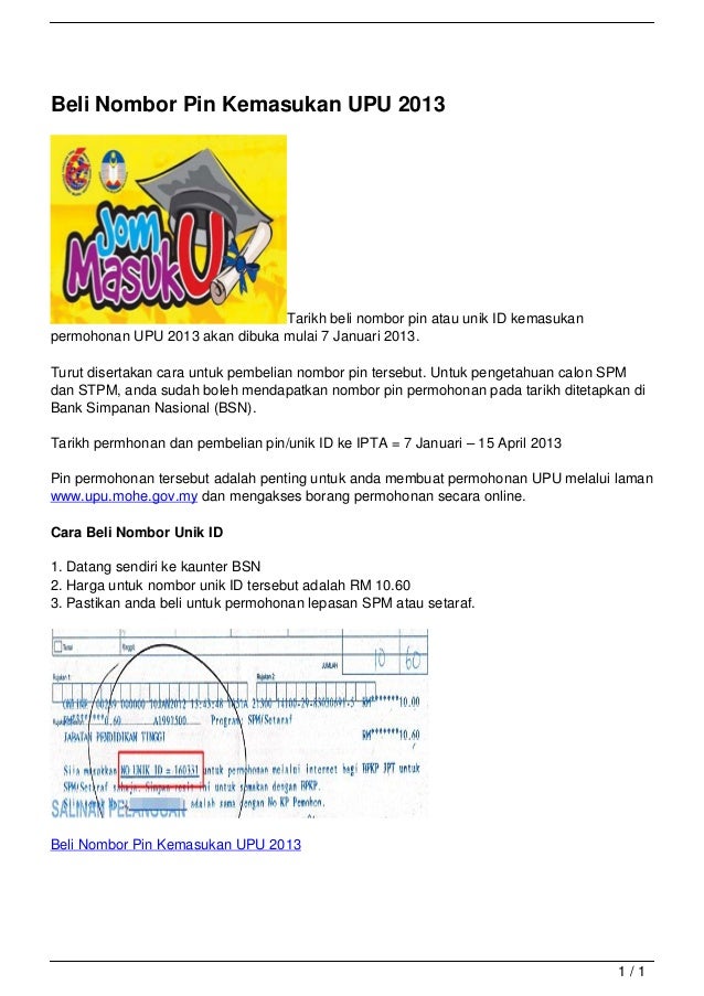 Beli No Pin Upu / Pin unik id upu tahun 2020:. Cara beli no pin upu bsn 2021/2022. Nombor unik id upu ini wajib di beli. Untuk makluman anda, pembelian no. Kami menerima pertanyaan, pemohon upu yang hilang no pin upu yang telah dibeli di bsn berhampiran. Untuk memohon dan mengemaskini permohonan pemohon perlu menggunakan no pin yang dibeli di bank simpanan nasional tidak kira apa jua kategori permohonan seseorang itu.