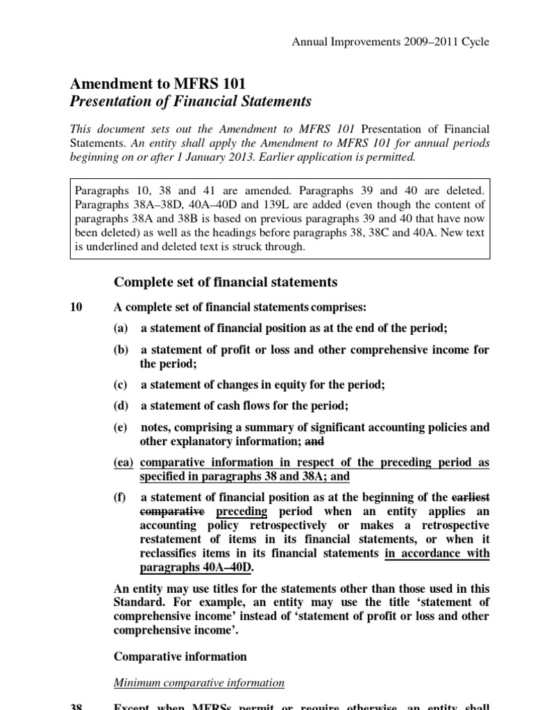 For example, it contains the general rules concerning the presentation of a true and fair view, the format of the balance sheet, income statement and. Based on the mfrs 101 , mfrs 107, mfrs 118, mfrs 124, and mfrs 9 discuss the definitions, recognition, measurement, recordings and presentation of each mfrs referring their roles in the financial statement. This document sets out the amendment to mfrs 101 presentation of financial statements. Paragraphs 10, 38 and 41 are amended. Entities are expected to make disclosure of