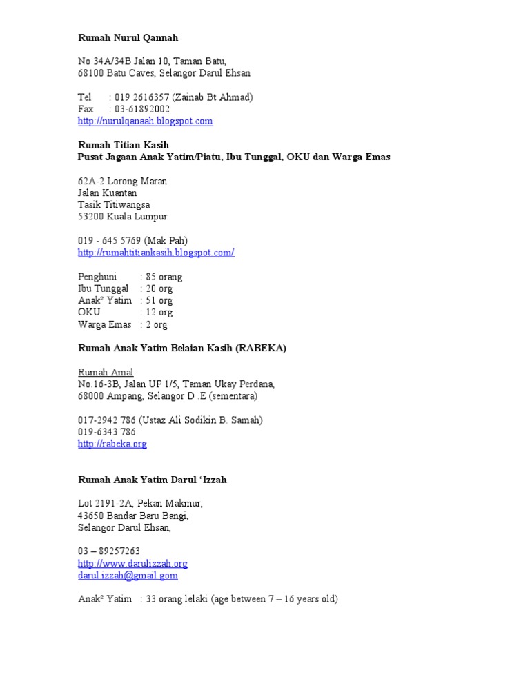 Rumah Kasih Nurul Hasanah Sebarang Pertanyaan Hubungi Kami 011 36711965 from rumahanakyatim.org Anak yatim adalah anak yang ditinggal meninggal ayahnya ketika belum dewasa. Ramlee, setapak, 53000 kuala lumpur. Rumah anak yatim di selangor. 1, taman sabariah, jalan pengkalan chepa, 15400 kota bharu, kelantan tel : Lawatan ke rumah anak yatim gadong rembau, negeri sembilan. 6 anak yatim perempuan jadi mangsa cabul dan rogol penjaga 55 tahun di ampang jaya. 2, jalan 5/71b, pinggir taman tun dr ismail, jalan damansara, 60000 kuala lumpur. Pertubuhan kebajikan anak yatim malaysia (peyatim) 37, jalan nirvana 39, taman nirvana, 68000 ampang, selangor tel :